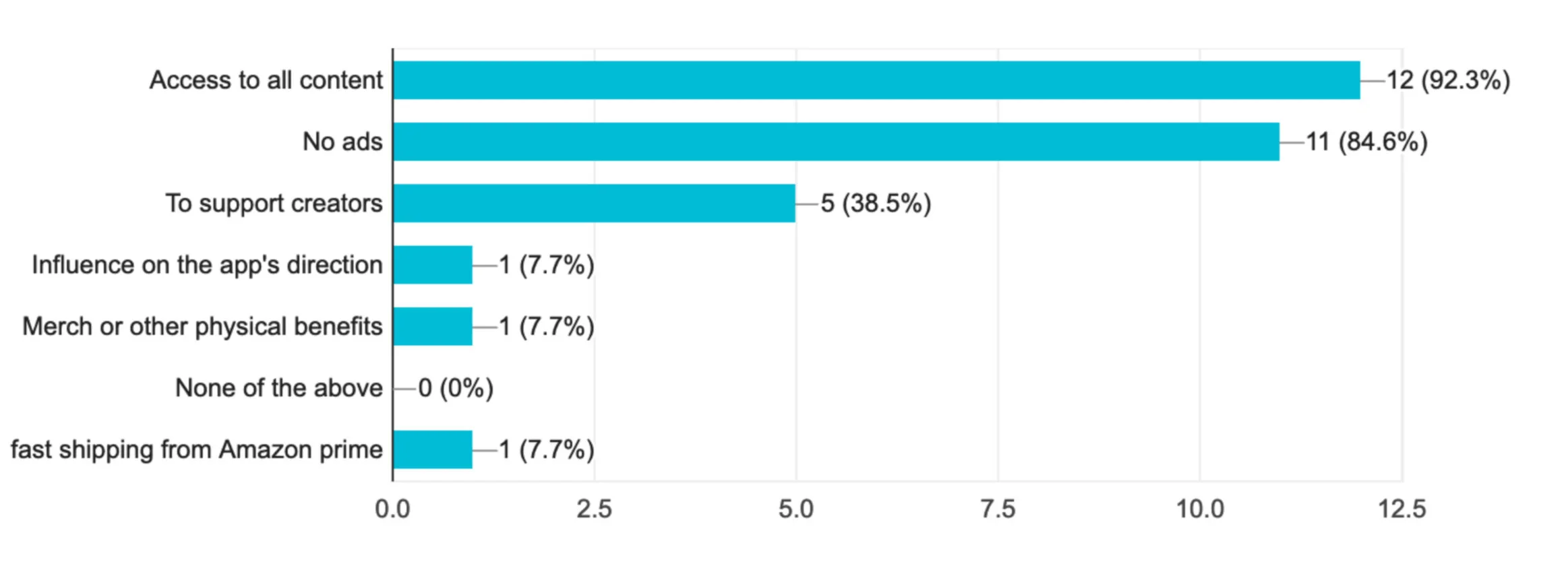But before I knew how to encourage users to upgrade, I needed to know what people would be willing to pay for. To that end, I created a questionnaire to get a sense of how consumers - particularly in Scry’s target demographic - interact with streaming apps.
