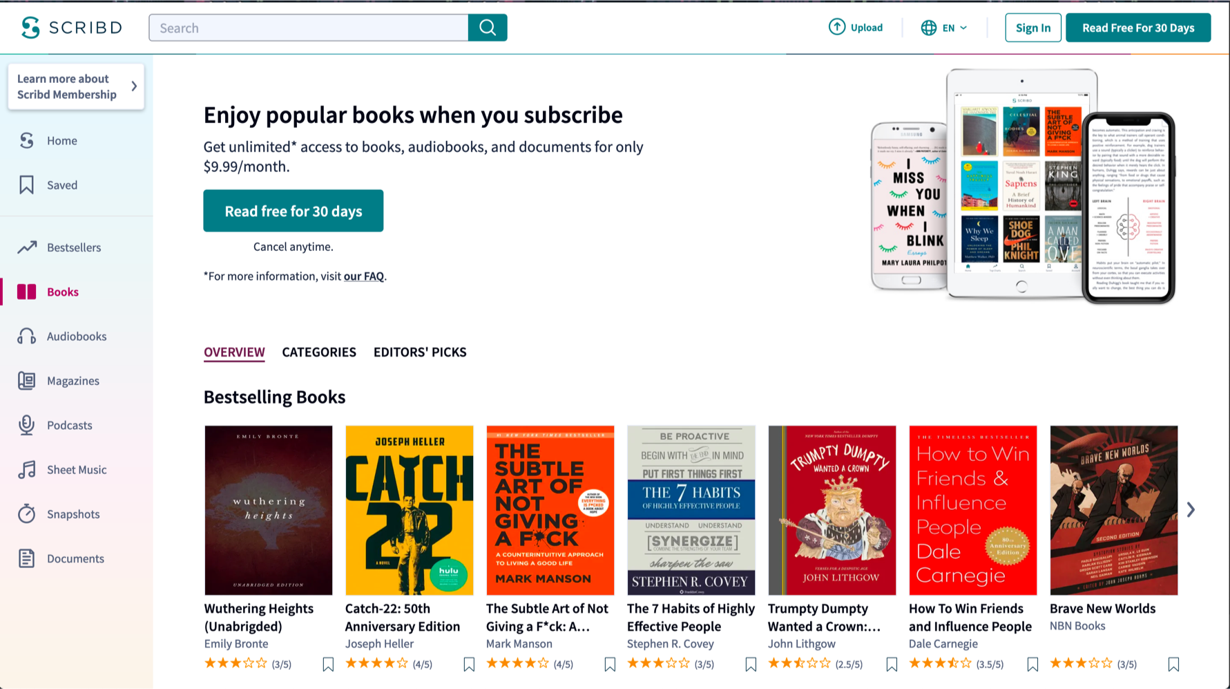 I first looked at Scribd.com. As a website that aggregates books and audiobooks, among other things, I wanted to see how they managed it. Breaking down by category is useful, though there aren’t enough filter options.