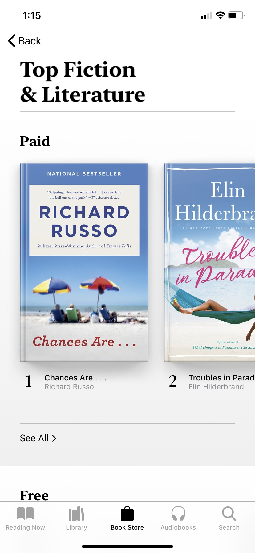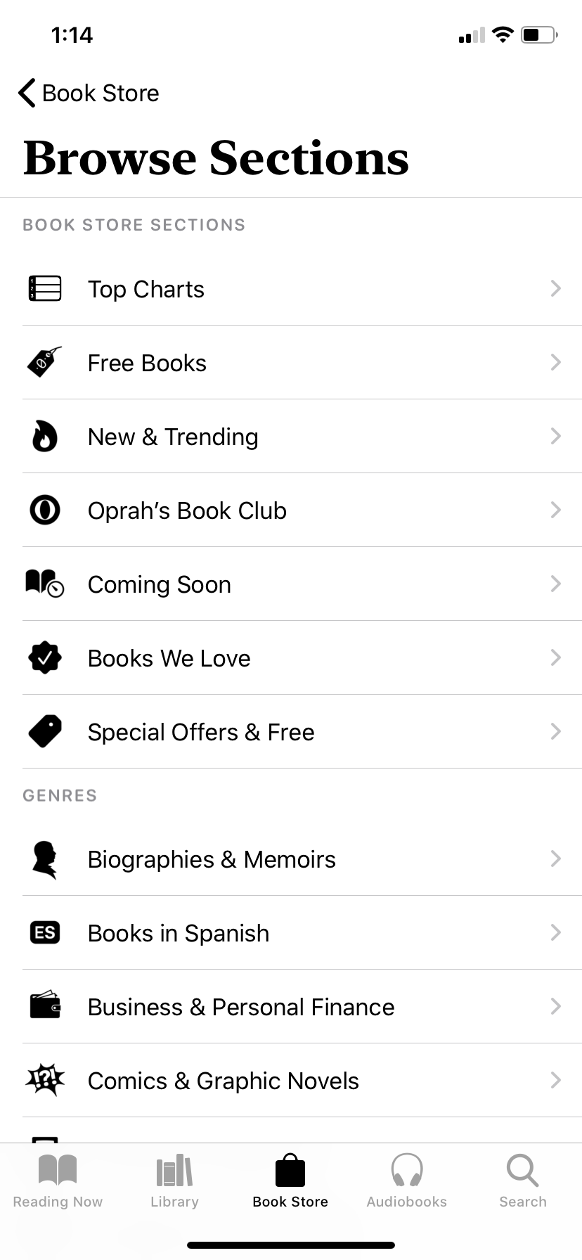 Moving to mobile, I looked at the Books app that comes on the iPhone. It does provide categories to browse in, but other than a search bar, there aren’t clear ways to pare down your search.