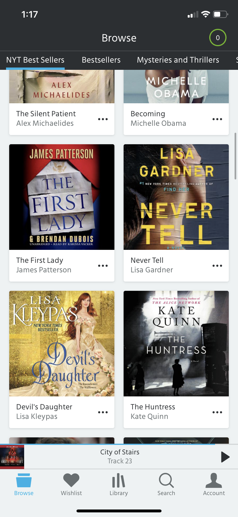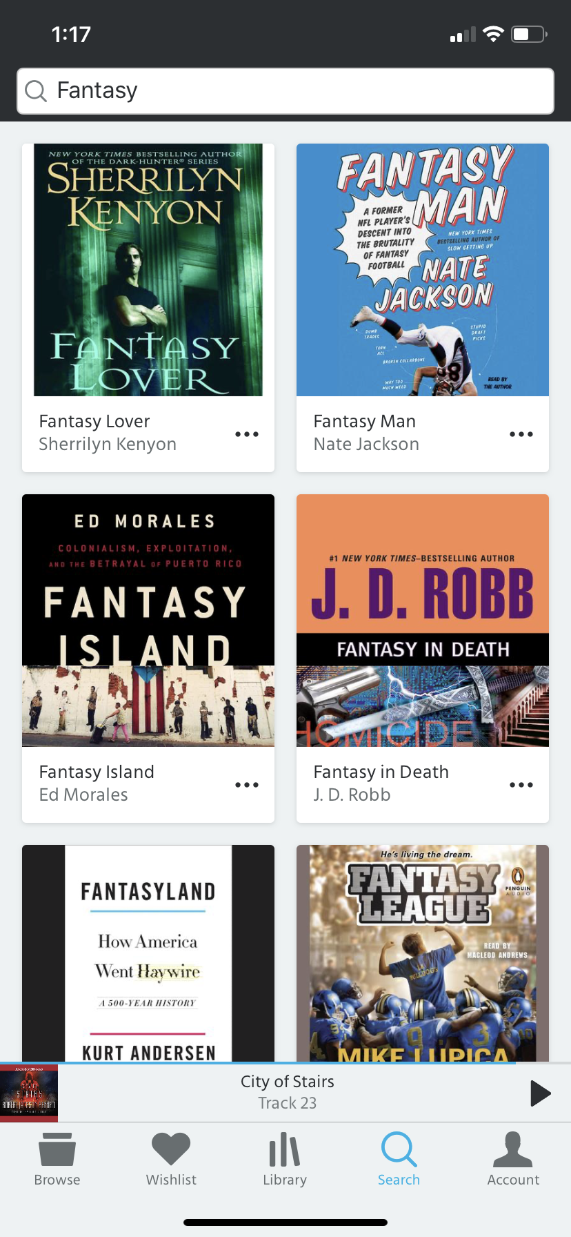 Continuing with mobile, I looked at Downpour, which is an audiobook app. I wanted to see how quickly one can find books. While it does have a library category, which allows you to find books you own, you can only search by one metric at a time.